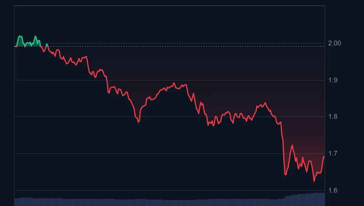 Ціна токена впала на 15,6% за останні 24 години до $1,68, що знизило його ринкову капіталізацію до $2,85 мільярда. Токен досяг історичного максимуму в $2,42 24 вересня 2025 року; за його поточною ціною він торгується приблизно на 31% нижче цього піку. !