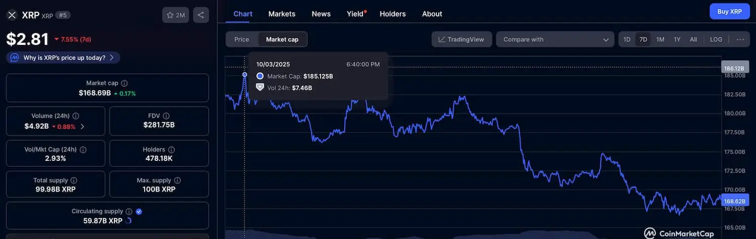 XRP за останні сім днів втратив 16,47 мільярда доларів у ринковій капіталізації, оскільки його капіталізація знизилася з 185,15 мільярда доларів 3 жовтня до 168,68 мільярда доларів до 10 жовтня, згідно з даними, отриманими з платформи ринкових даних.