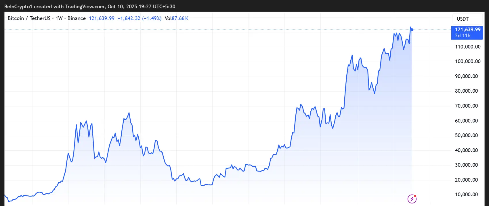 Оскільки уряд США залишається закритим на фоні ще одного бюджетного конфлікту, Біткойн зріс до нового історичного максимуму. Після досягнення позначки $126,199, піонер криптовалюти знизився і торгувався за $121,960 на момент написання.