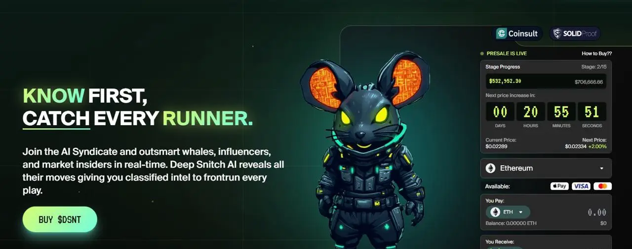 Пресейл DeepSnitch AI поєднує енергію мемів з концепціями штучного інтелекту, обіцяючи використовувати машинне навчання для виявлення вірусних трендів та можливостей мем-токенів. Його наратив проекту, що базується на штучному інтелекті, орієнтований на трейдерів, які шукають наступний успіх у перетині “ШІ та мемів”.