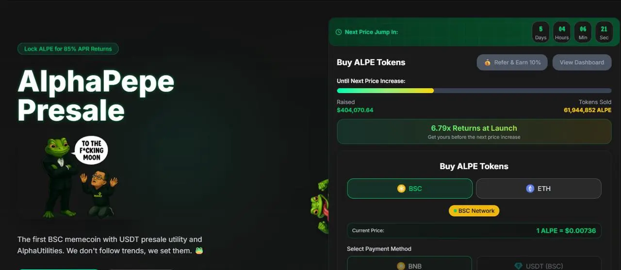 AlphaPEPE (ALPE) - це ще один популярний мем-токен, який націлений на ринок попереднього продажу з акцентом на стейкінг, NFT та корисність BNB Chain. Його попередній продаж здобув лояльну аудиторію, накопичивши понад 3,000 власників і пропонуючи живі винагороди за стейкінг до 85% APR — перевага, яка рідко зустрічається на етапах попереднього продажу.
