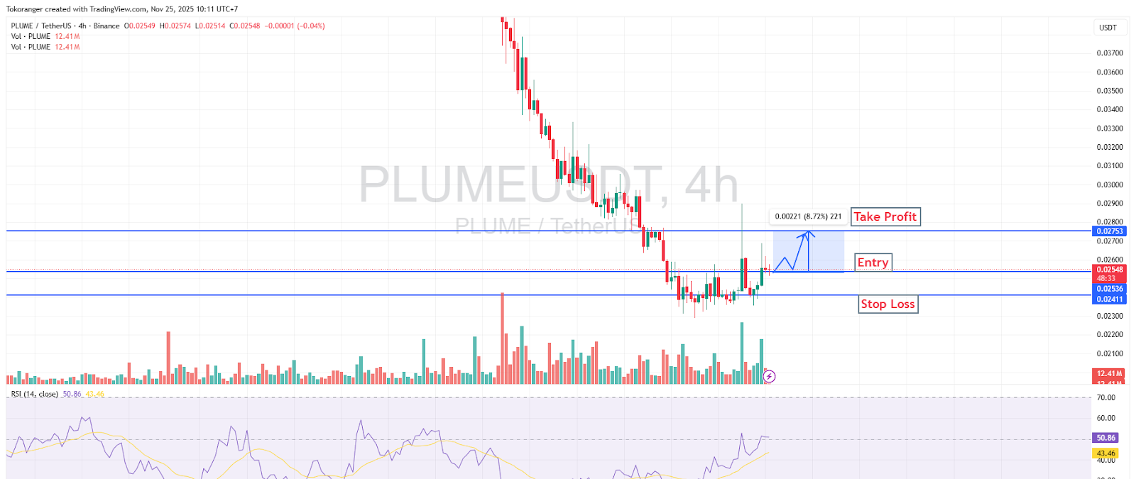 PLUME починає демонструвати ознаки здорового відновлення після відскоку від сильної зони підтримки 0.0241-0.0253, де обсяги покупок також починають зростати, що є сигналом того, що ринок знову починає “ризикувати”.