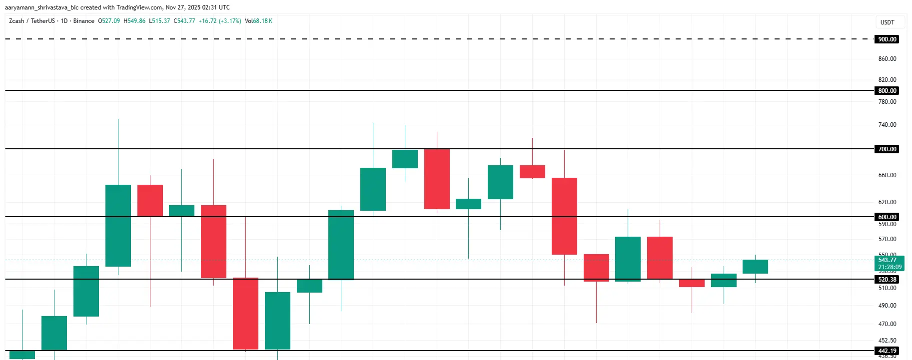 ZEC в даний час торгується по $543, утримуючись вище рівня підтримки $520 , але намагається пробити $600. Цей діапазон обмежує рух альткойна, оскільки інвестори чекають на чіткіші сигнали як з боку ринкових настроїв, так і з боку регуляторних розробок.