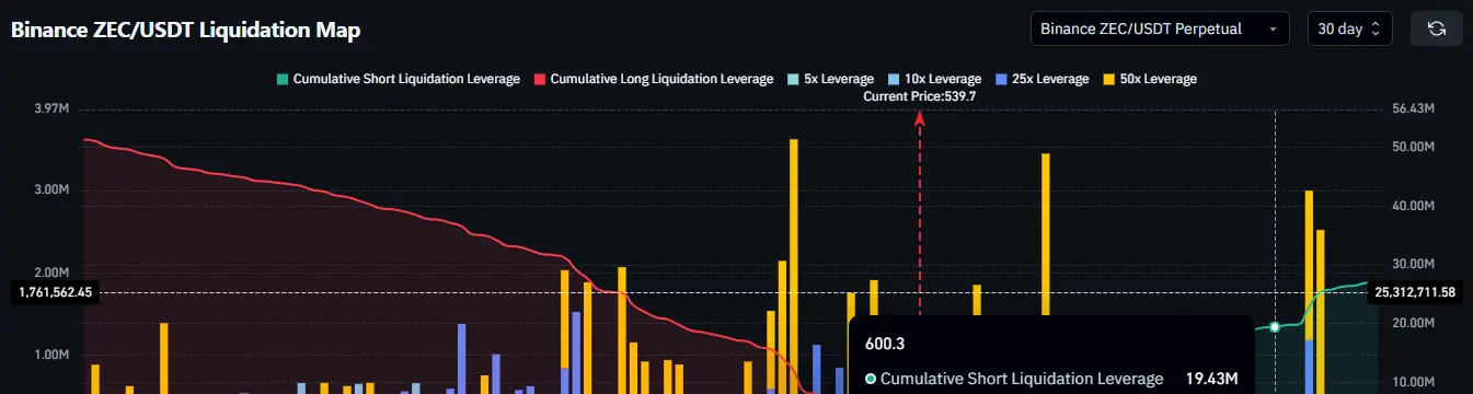 Дані з ланцюга та похідних також сигналізують про потенційний ріст. Карта ліквідації Zcash показує, що короткі трейдери можуть бути в уразливій позиції. Помірний рух ціни до наступного опору на $600 може спровокувати приблизно 19,43 мільйона доларів ліквідацій коротких позицій.