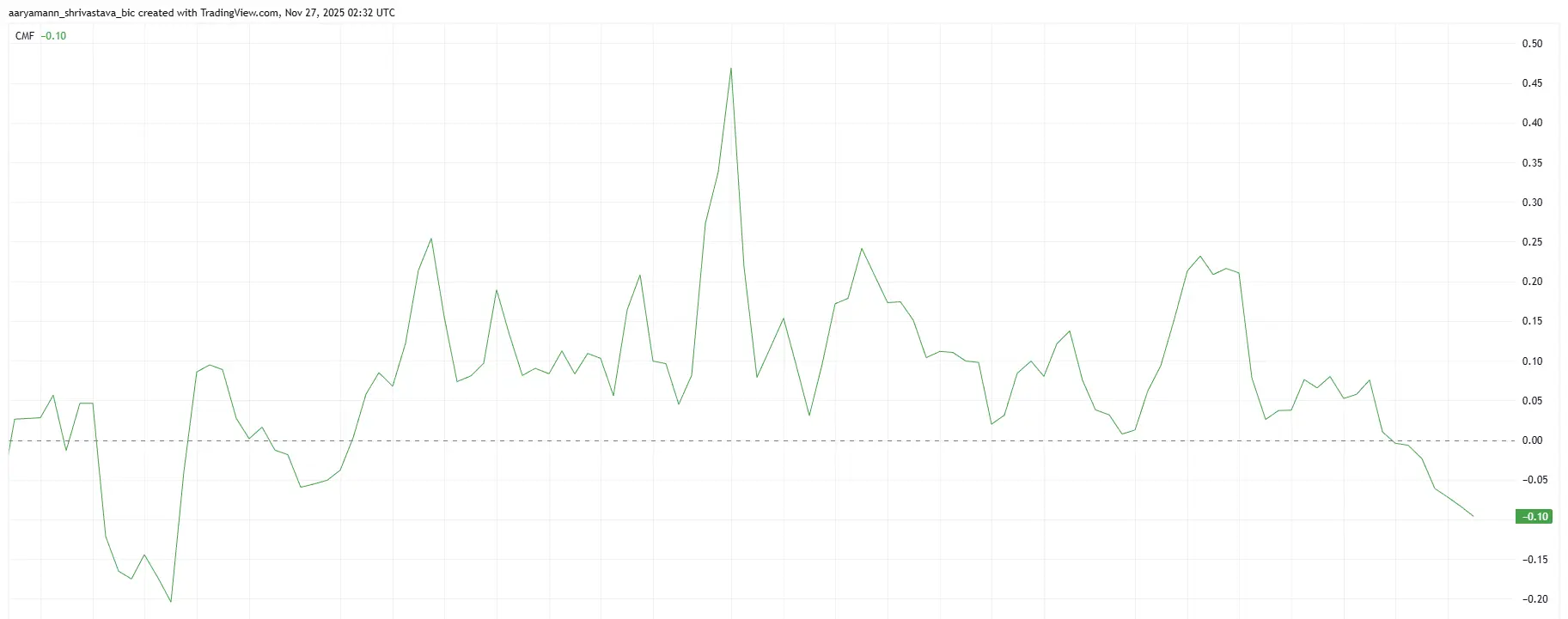 Ринкові індикатори показують, що Zcash стикається з постійними відтоками. Графік Chaikin Money Flow (CMF) на денному графіку має тенденцію до зниження, що відображає слабкий попит з боку інвесторів. Оскільки ціна ZEC не змогла досягти значних приростів, багато тримачів почали виходити з позицій, щоб уникнути глибших втрат.