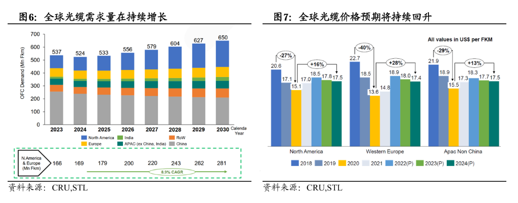 “Жорсткість” пропозиції оптоволоконної продукції є основою нинішнього сценарію підвищення цін. Guotai Haitong зазначає, що ключовою вузловою точкою у ланцюгу є виробництво заготовок для оптоволоконних стрижнів (光棒), розширення виробництва триває 2-3 роки. Після минулого циклу низьких цін у галузі довжина виробничого потенціалу для стрижнів майже вичерпана, а рішення про розширення виробництва у більшості компаній є обережними, що спричиняє повільне зростання глобального потенціалу для стрижнів і жорсткість загальної пропозиції.