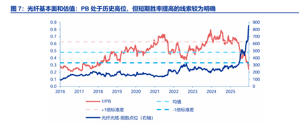 Однак, на відміну від сховищ, оцінка сектору оптоволоконного зв’язку не є низькою. Shenwan Hongyuan чітко вказує, що PB сектору знаходиться на історично високому рівні, що переважно зумовлено попереднім ринковим ціноутворенням на оптоволоконні з’єднання, і це означає, що ринок більше залежить від реалізації підвищення цін і посилення фундаментальних показників. Якщо підвищення цін пошириться або попит стане менш прогнозованим, сектор швидше за все перейде від тренду зростання до високих рівнів коливань.