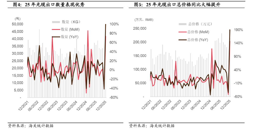 Вихід на міжнародний ринок відкриває для вітчизняних виробників ще один шлях до високої активності. Guotai Haitong зазначає, що у грудні 2025 року експорт оптоволоконних кабелів, оптоволокон і заготовок склав 41 тисячу тонн, що на 6,5% більше, а експортна вартість — 4,5 мільйона доларів, зростання на 41,8%; у 2025 році загальний експорт склав 454 тисячі тонн, що на 11,1% більше, а загальна вартість — 44,75 мільярдів доларів, зростання на 44,1%. Вони вважають, що вихід на міжнародний ринок став важливим джерелом прибутку для галузі.