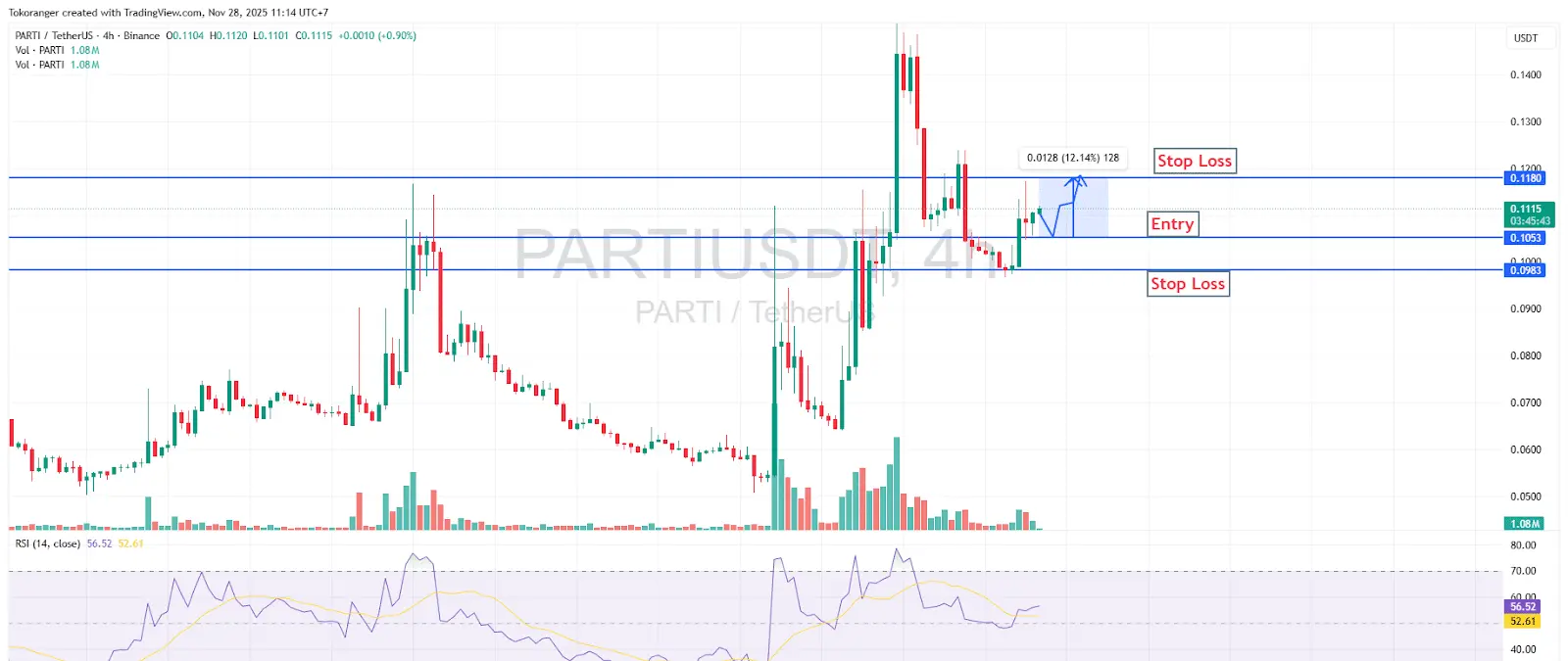 PARTI/USDT hiện đang hình thành mô hình rebound continuation sau khi giữ vững ở khu vực hỗ trợ 0.1053, cho thấy người mua bắt đầu chiếm ưu thế về động lực. Giá đã trở lại di chuyển trên đường vào và xây dựng cấu trúc higher-low mới, một dấu hiệu ban đầu cho thấy xu hướng ngắn hạn bắt đầu có xu hướng tăng.