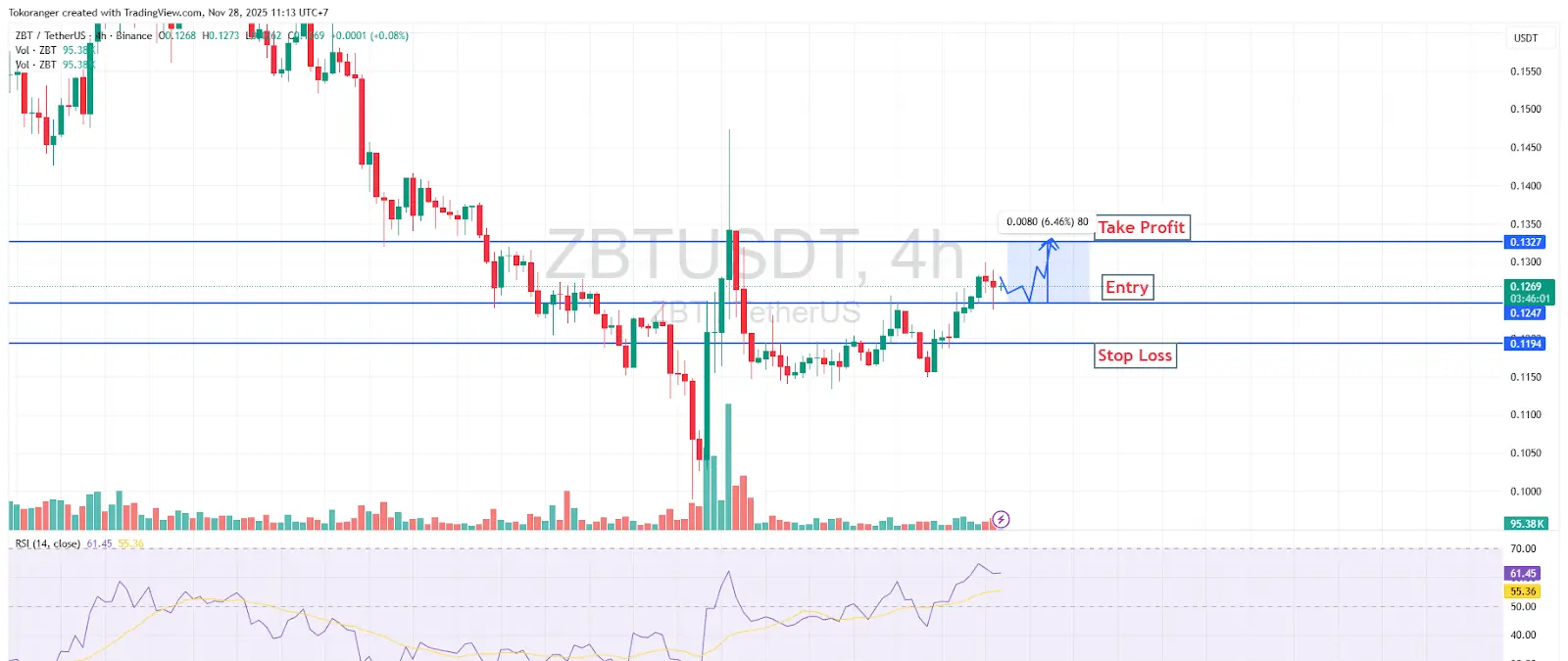 ZBT/USDT hiện đang bắt đầu bật lên từ hỗ trợ 0.1247 và cho thấy sự đảo chiều tăng giá khá mạnh, được đánh dấu bằng RSI liên tục tăng lên vùng 60, dấu hiệu sức mạnh mua bắt đầu chiếm ưu thế.