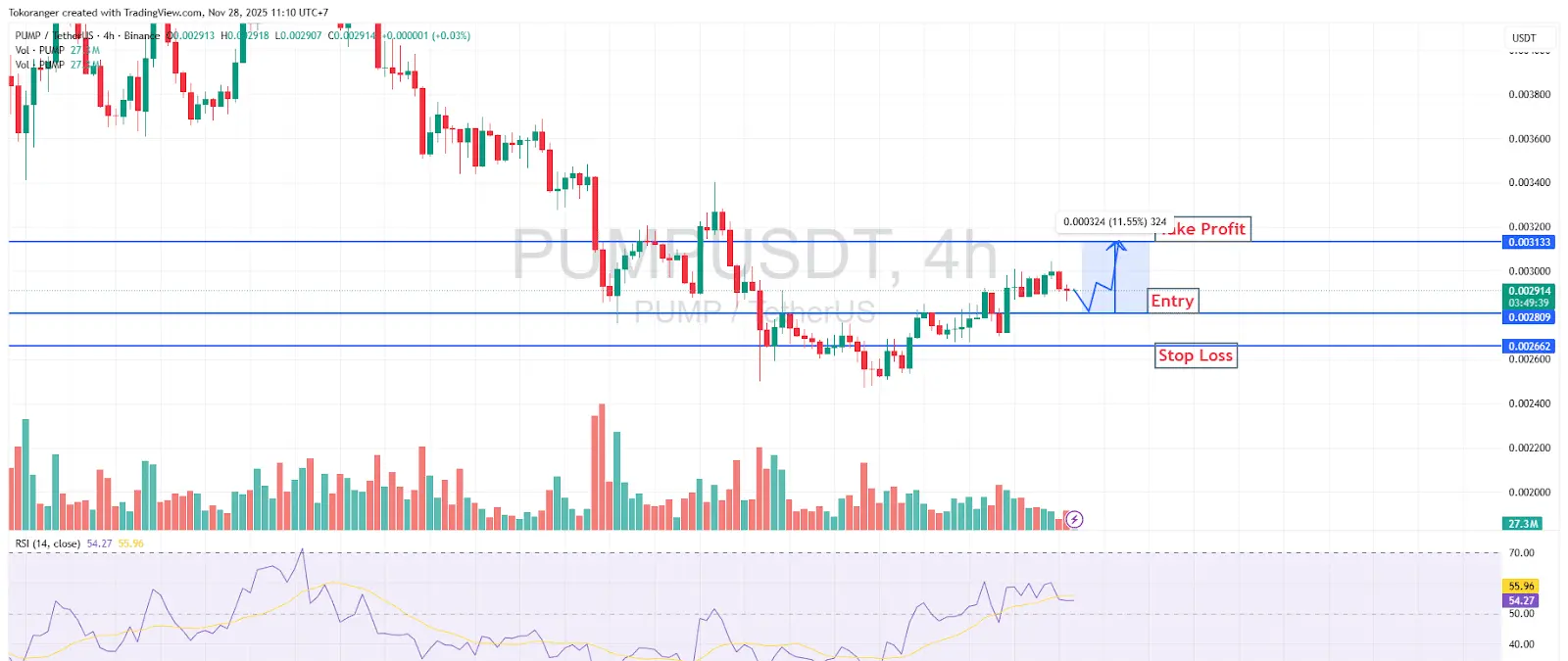 PUMP hiện đang cho thấy mô hình rebound thở dài sau khi kiên trì ở khu vực cầu 0.00266-0.00280, sau đó từ từ hình thành cấu trúc higher low mới. Điều này cho thấy thị trường bắt đầu “bơm sức mạnh” để cố gắng quay lại.