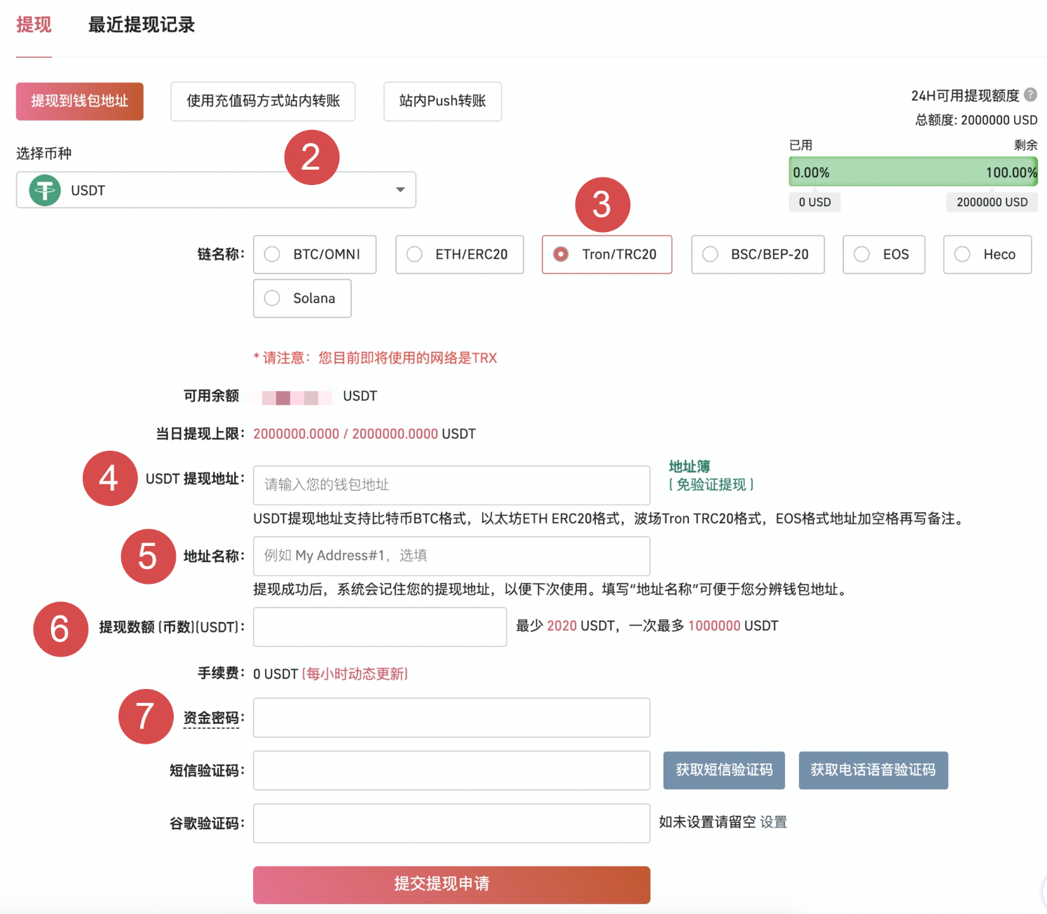 (最少 2020 USDT,最高单次提现可达 1000000 USDT,24h可提现总额度高达200万美元)