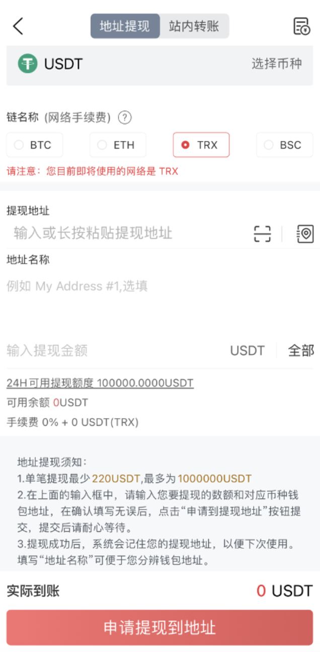3. 进入“地址提现”,链名称选用 “TRX”,输入或粘贴入“提现地址”(用户也可以直接扫描钱包的地址二维码)。“地址名”为选填项,用户可为该提现地址取一个名称,系统会在提现成功后记住该提现地址,简便下次提现过程。 填写“提现数额”后请确认地址和金额信息是否正确,点击“申请提现到地址“。
