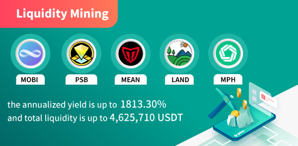 A total of 51 new versions of the liquidity mining pools (Automated Market Maker AMM) were released on Gate, including MOBI, PSB, MEAN, LAND, and MPH. As of January 31, 2022, their annualized yield is up to 1813.30%, and total liquidity tops at 4,625,710 USDT.