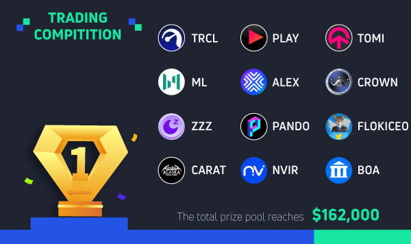 From April 16 to April 30, we held 12 trading competitions, including: TRCL, PLAY, TOMI, ML, ALEX, CROWN, ZZZ, PANDO, FLOKICEO, CARAT, NVIR, BOA. The total prize pool is $162,000.