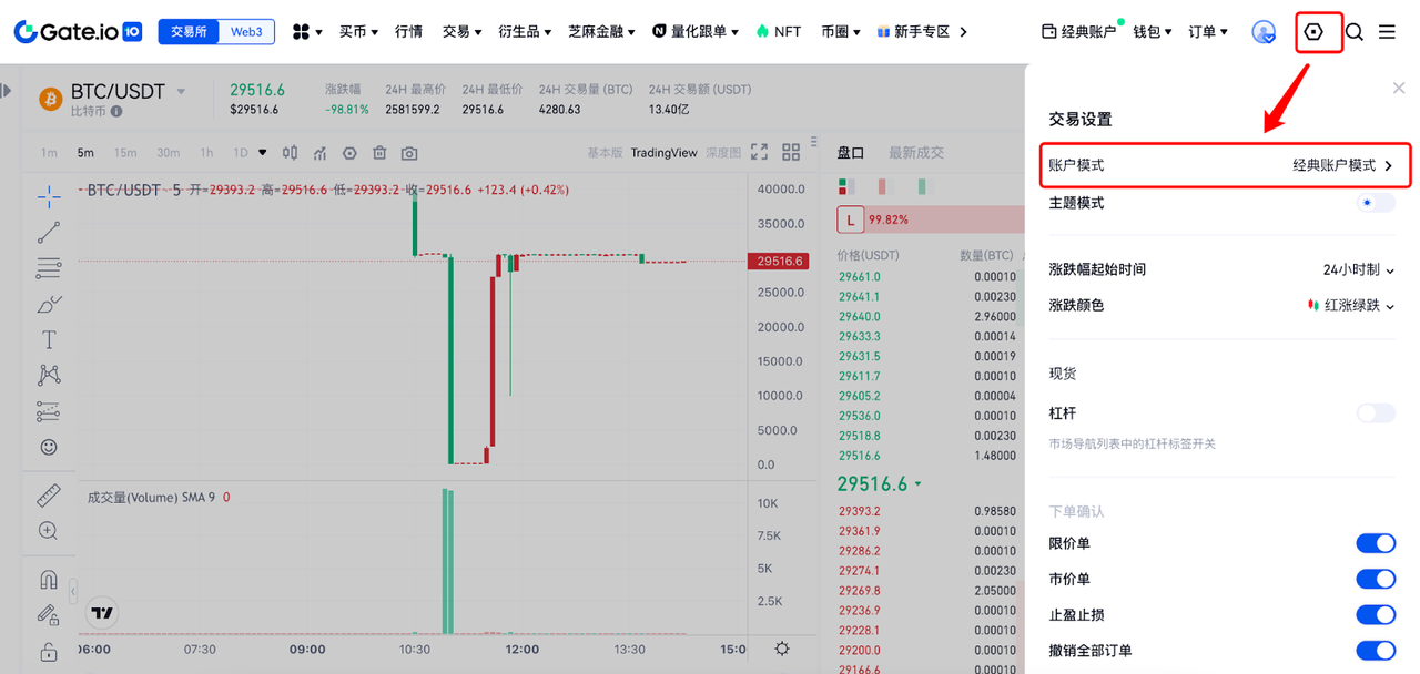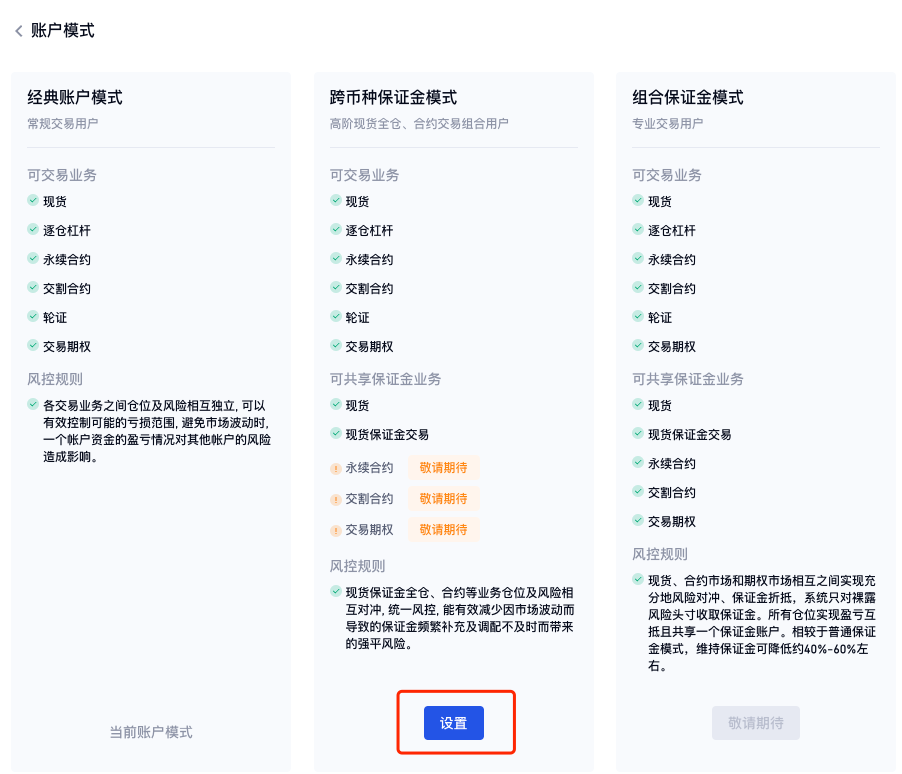 2、方法二:导航栏的“交易”——“现货交易”,进入现货交易页面,顶部设置按钮进入交易设置,切换“账户模式”到“跨币种保证金模式”