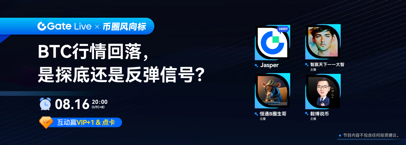 GateLive將於8月16日20:00(UTC+8)舉辦直播欄目《幣圈風向標》。我們將邀請三位平台主播參與其中,共同探討近期比特幣行情回落的原因,並深入分析相關策略和點位。