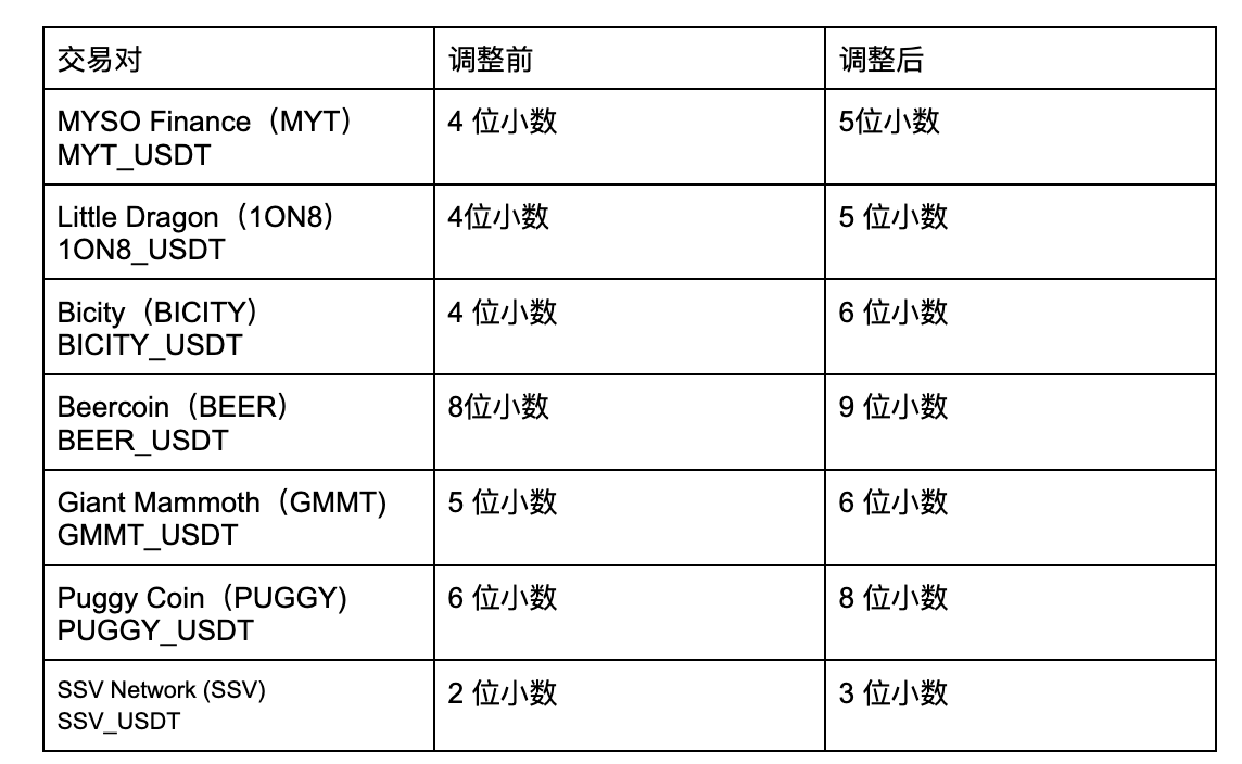 为提升市场的有效流动性和交易体验,Gate将于2024年8月27日10:00 (UTC+8) 调整SSV,PUGGY,GMMT,BICITY,MYT,1ON8,BEER多个现交易对的最小价格精度(单位价格涨跌变动的最小值)
