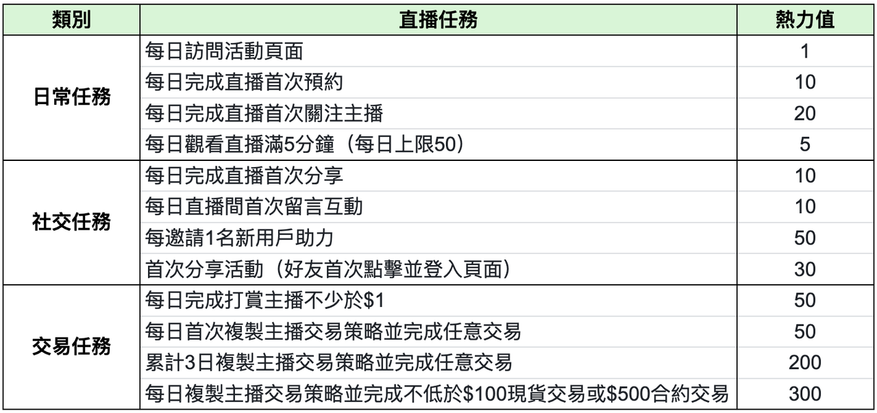 1.每日完成“日常”、“互動”、“交易”直播任務,獲得“熱力值”。