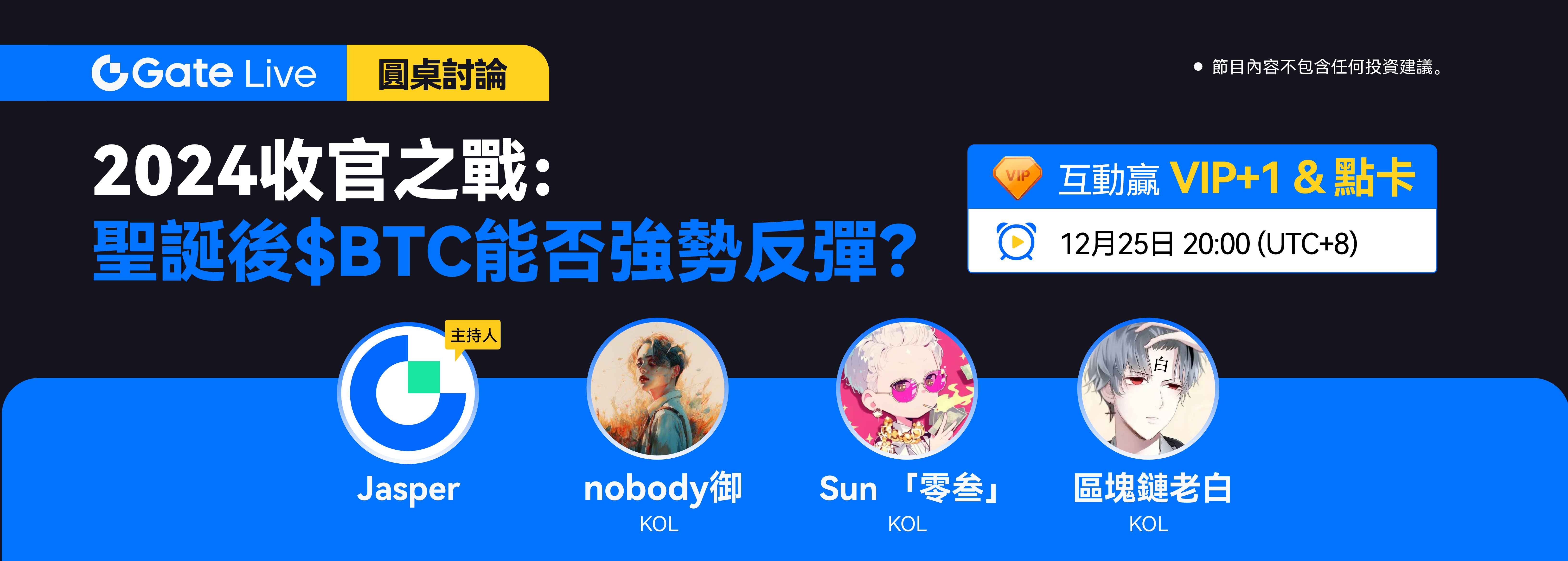 GateLive 將於 12月25日 20:00(UTC+8)舉辦直播欄目《圓桌討論》。我们將邀請三位區塊鏈研究員參與其中,一同探討比特幣、以太坊及其他主流幣在聖誕節後的表現及相應操作策略。