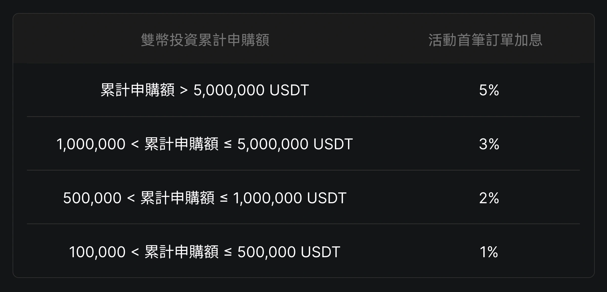 - 活動期間所有幣種和方向的雙幣投資訂單均計入申購數量計算。