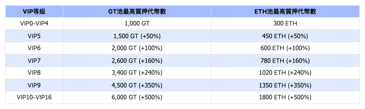 VIP5 及以上用戶參與Launchpool享有專屬質押額度提升權益,最高可享500%質押額度加成。