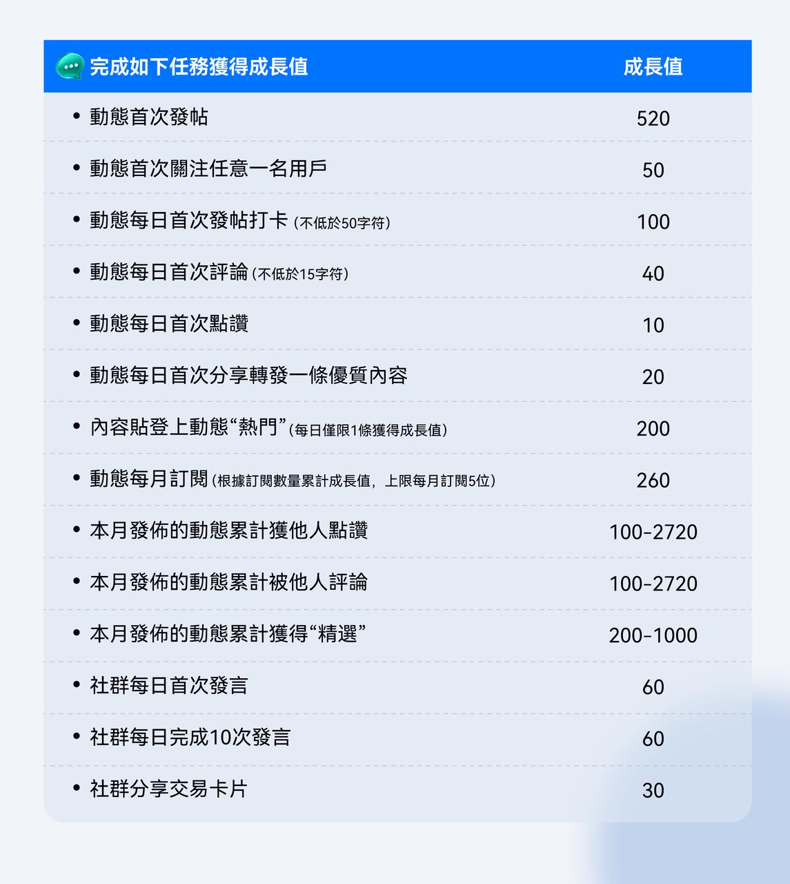 完成如下發帖、評論、點讚、發言等任務,即可獲得對應的成長值。