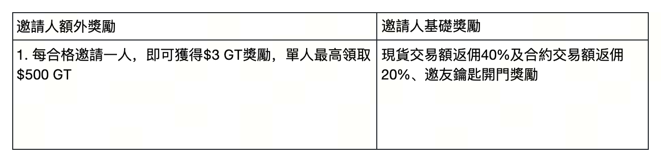 每邀請一位合格新好友即可獲得$3 GT獎勵。邀請的好友越多,GT獎勵越多;每人最高領取$500 GT。