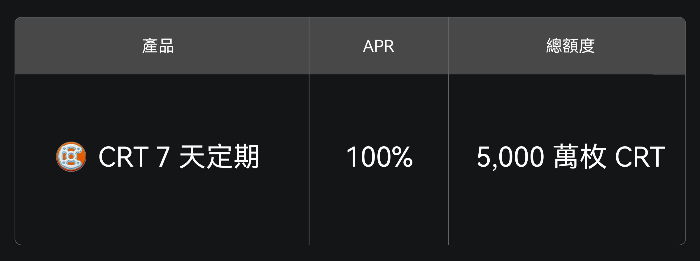 Gate 餘幣寶重磅上線 CRT 7 天定期理財,年化收益 100%,總額度 5,000 萬枚 CRT,限量發售,先到先得。