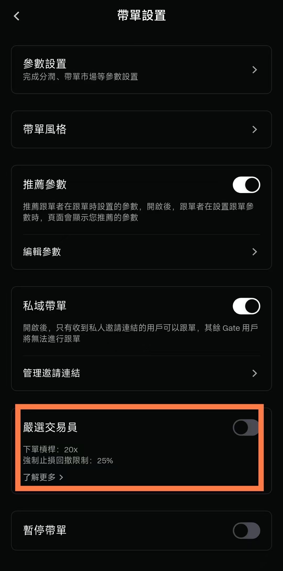 1. 嚴選帶單員功能已在 App 端「我的帶單-帶單設置」頁面及 Web 端「帶單模式」合約頁面上線