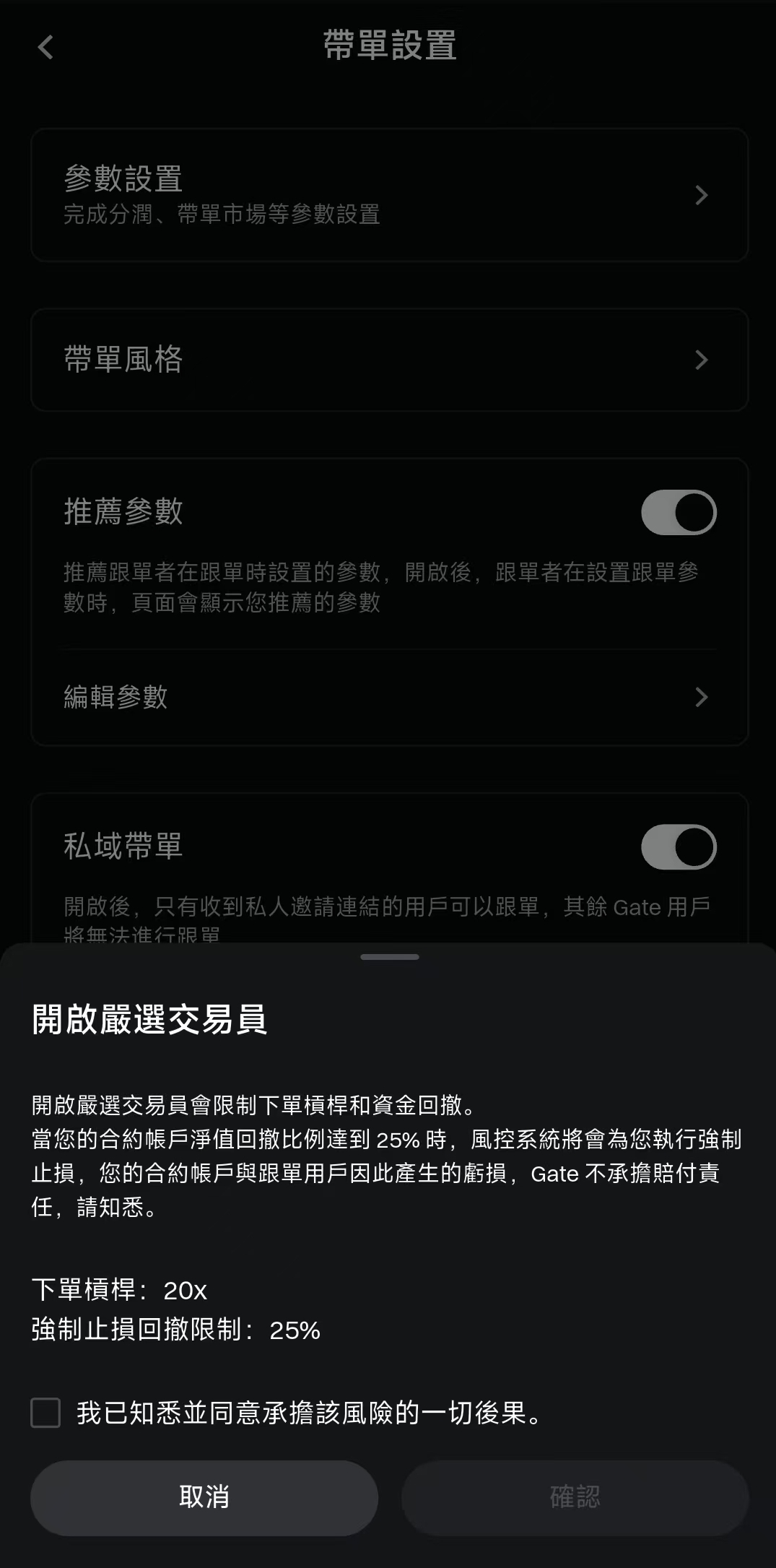 3. 開啟後,系統將自動應用風控規則(帶單市場最大下單槓桿 20x、強制止損回撤 25%)
