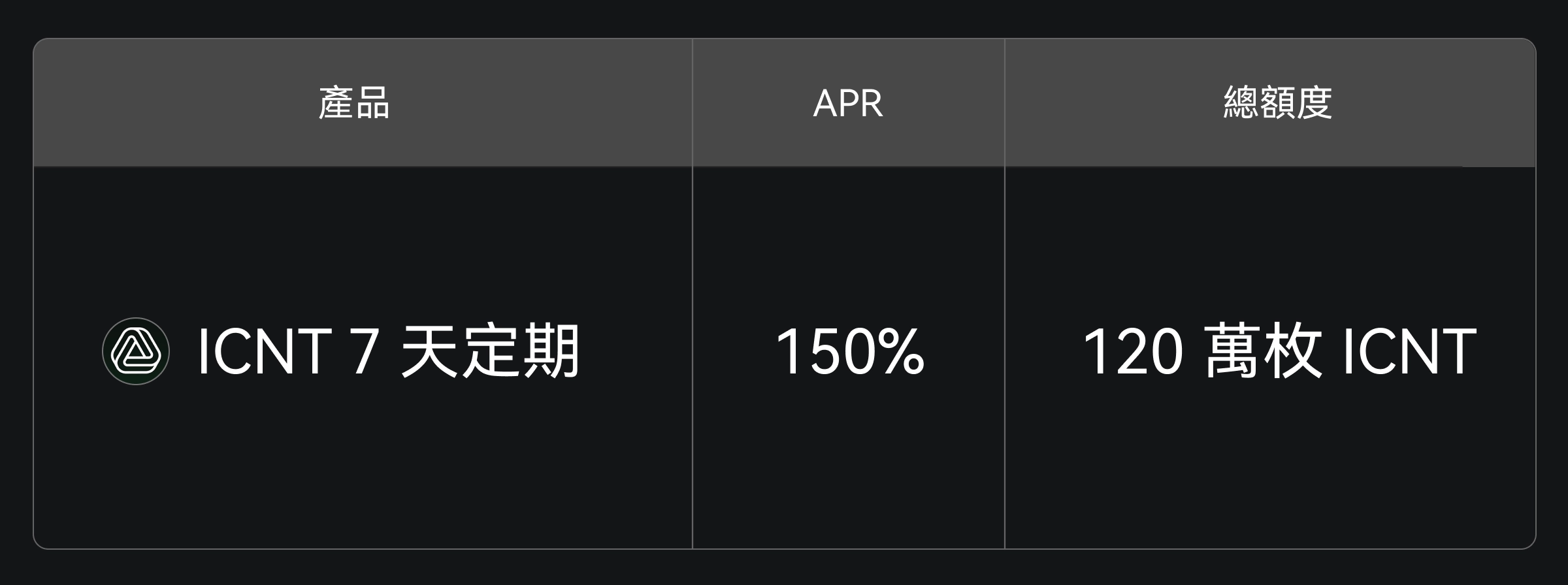Gate 餘幣寶現已上線 ICNT 7 天定期理財,年化收益 150%,總額度 120 萬枚 ICNT,限量發售,先到先得。