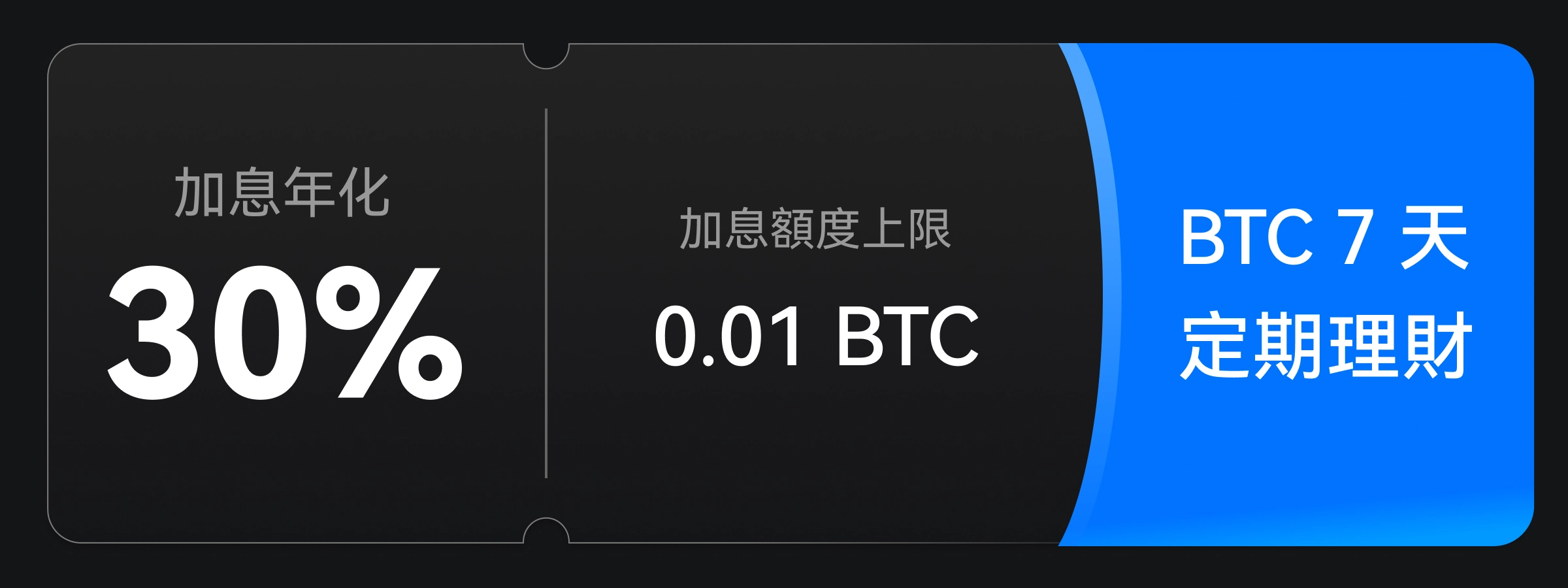 活動前未使用過餘幣寶的用戶,在活動期間 BTC 累計淨申購金額 ≥ 0.01 BTC(含活期與定期),可獲得 1 張 30% BTC 加息券: