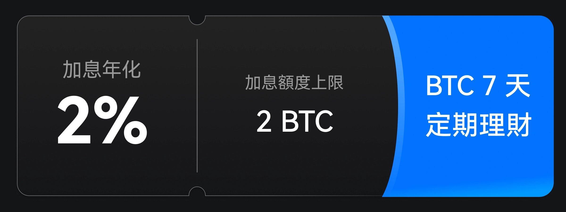 活動期間完成報名的用戶,在活動期間 BTC 累計淨申購金額 ≥ 0.1 BTC(含活期與定期),可獲得 1 張 2% BTC 加息券:
