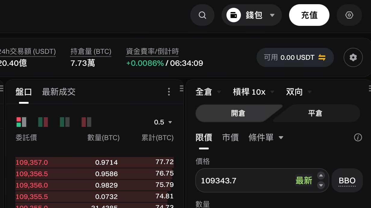 連接錢包後,會出現充值入口位於交易介面的右上方,您可以點擊 右上角「充值」按鈕