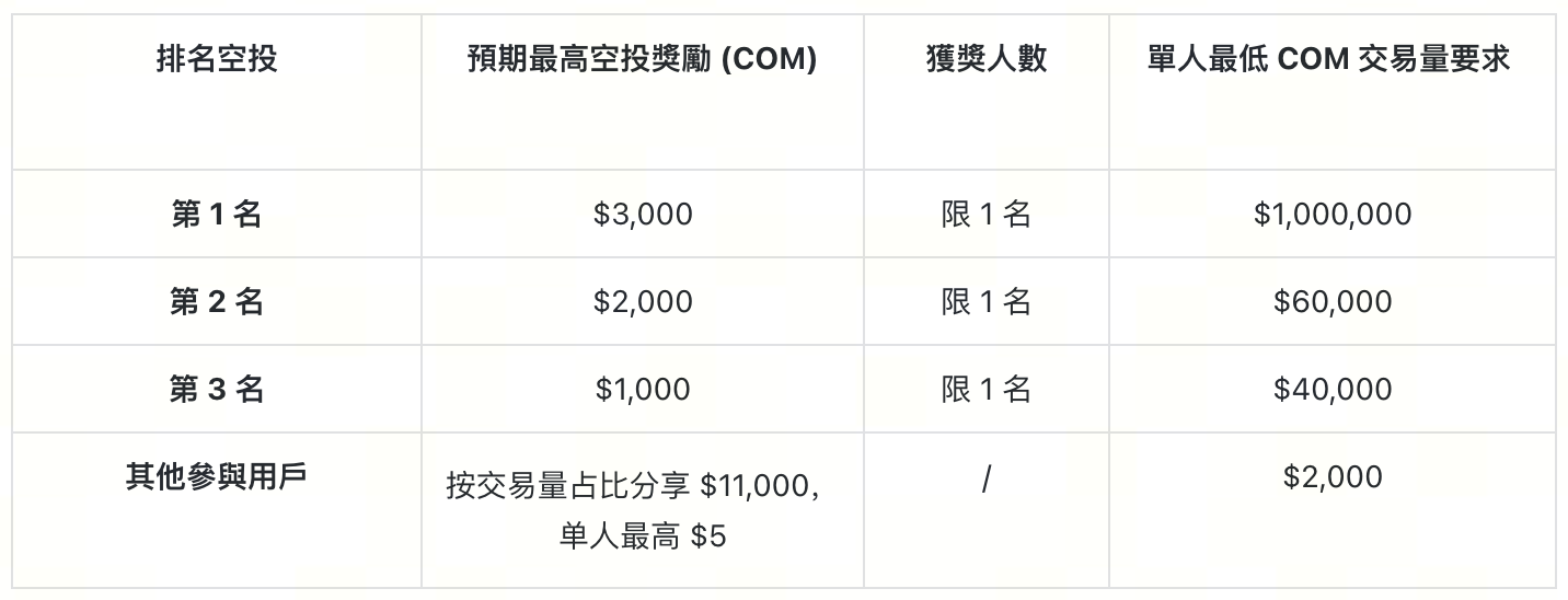 - 在交易排名賽中,若所有參賽用戶都未達到單人最低 COM 交易量要求,則對應的空投獎勵將不予發放。所有達到最低交易量要求的用戶,將依據達成時間先後順序,依次獲得前 3 名固定獎勵名額。