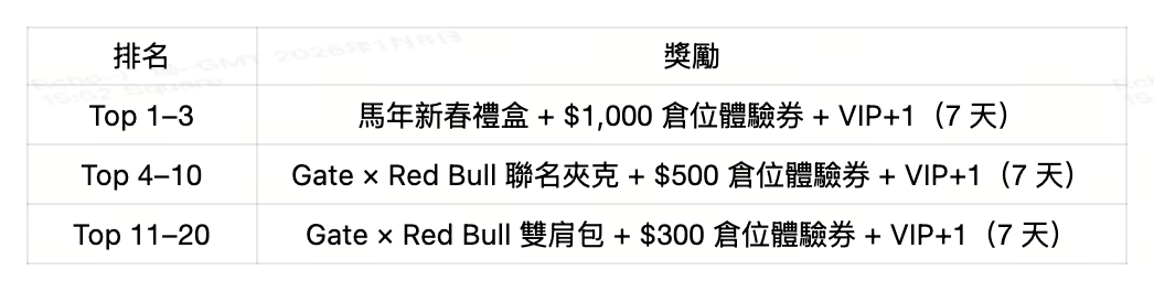 - 實體週邊獎勵將於活動結束後 14 個工作日內透過電子郵件及站內信通知得獎者。請於收到通知後 30 日內前往 Gate 週邊商城 填寫寄送資訊。逾期未填、資訊錯誤或無人簽收等情況,將視為自動放棄獎勵;寄送資訊提交後無法修改,請務必確認正確無誤。獎勵將於成功提交寄送資訊後 60 日內完成發放。如遇物流異常或獎品缺貨,實體獎勵將依以下標準轉換為倉位體驗券:Gate 新春禮盒:500 倉位體驗券、Gate × Red Bull 聯名夾克:$300 倉位體驗券、Gate × Red Bull 雙肩包:$200 倉位體驗券。