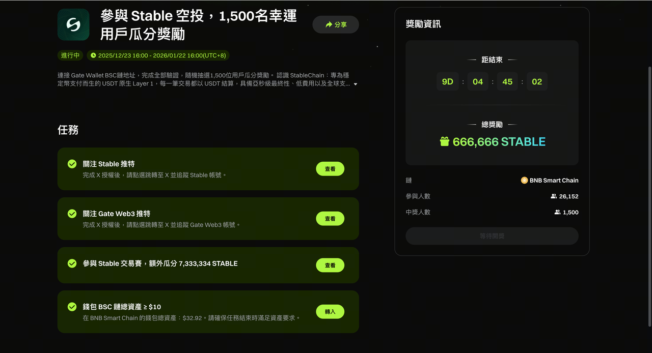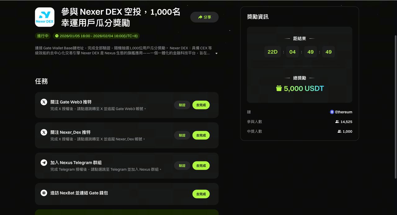 鏈上任務:需使用 Gate Wallet 與區塊鏈應用進行交互,例如去中心化交易(DEX)交易、DeFi 協議操作等。