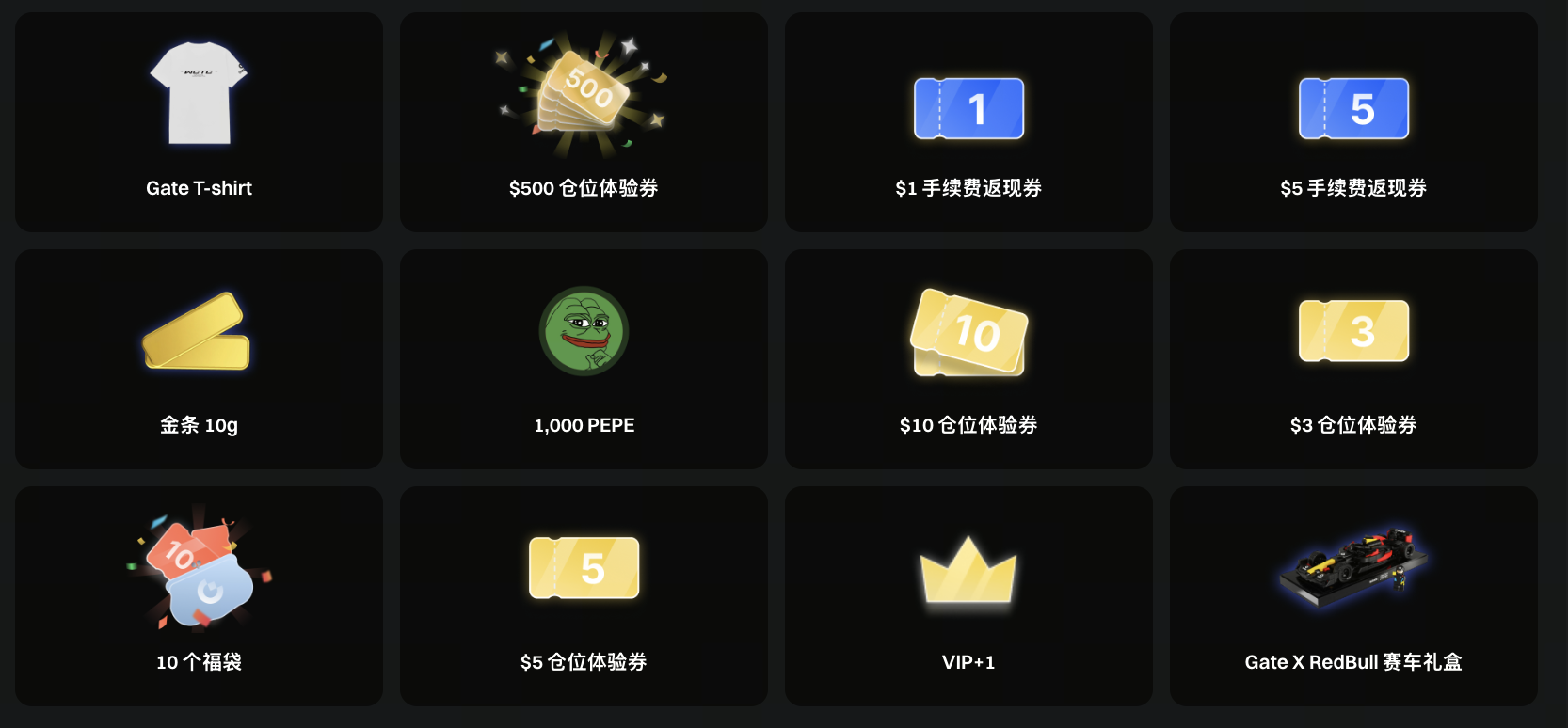 10. 仓位体验券、代币、福袋等奖励将会在活动结束后的 30 个工作日内完成发放,请及时查收您的账户。周边和实物奖励将在活动结束后 60 日内,审核符合发奖条件后会自动完成空投发放,请注意留意您的物流信息;若因物流原因导致奖励无法送达,周边奖励将以等值仓位体验券形式发放,其中 金条 以 $10,000 仓位体验券,Gate X RedBull 积木赛车礼盒以 $500 仓位体验券,Gate 文化衫以 $200 仓位体验券发放。