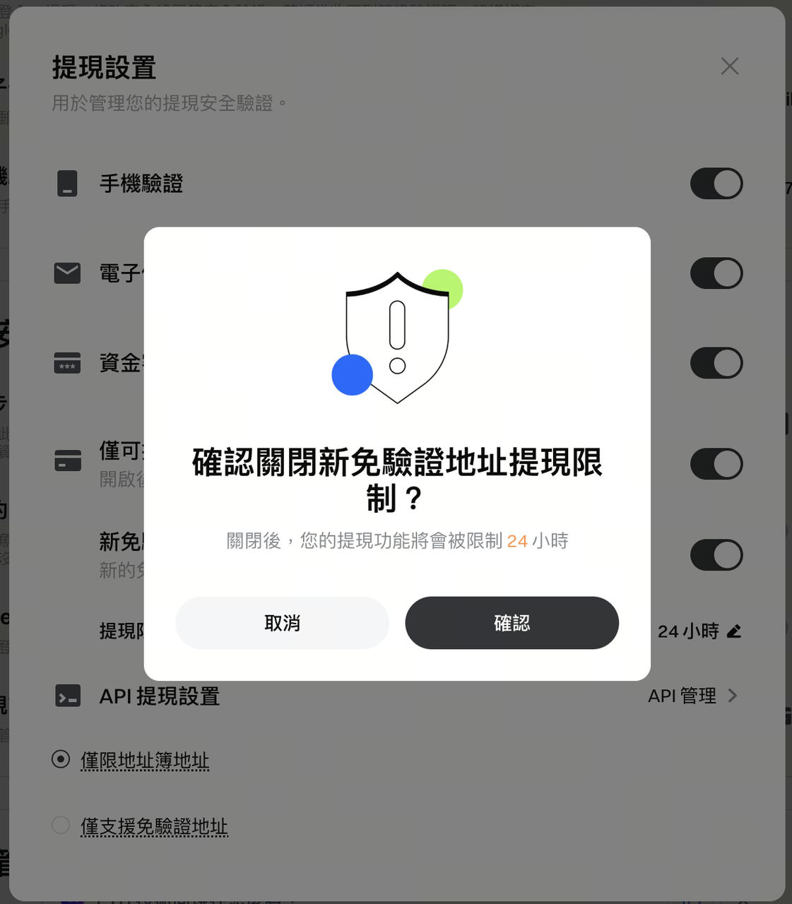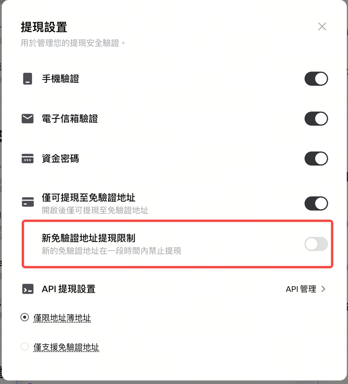 1.安全中心 > 提現設置 > 新免驗證地址提現限制