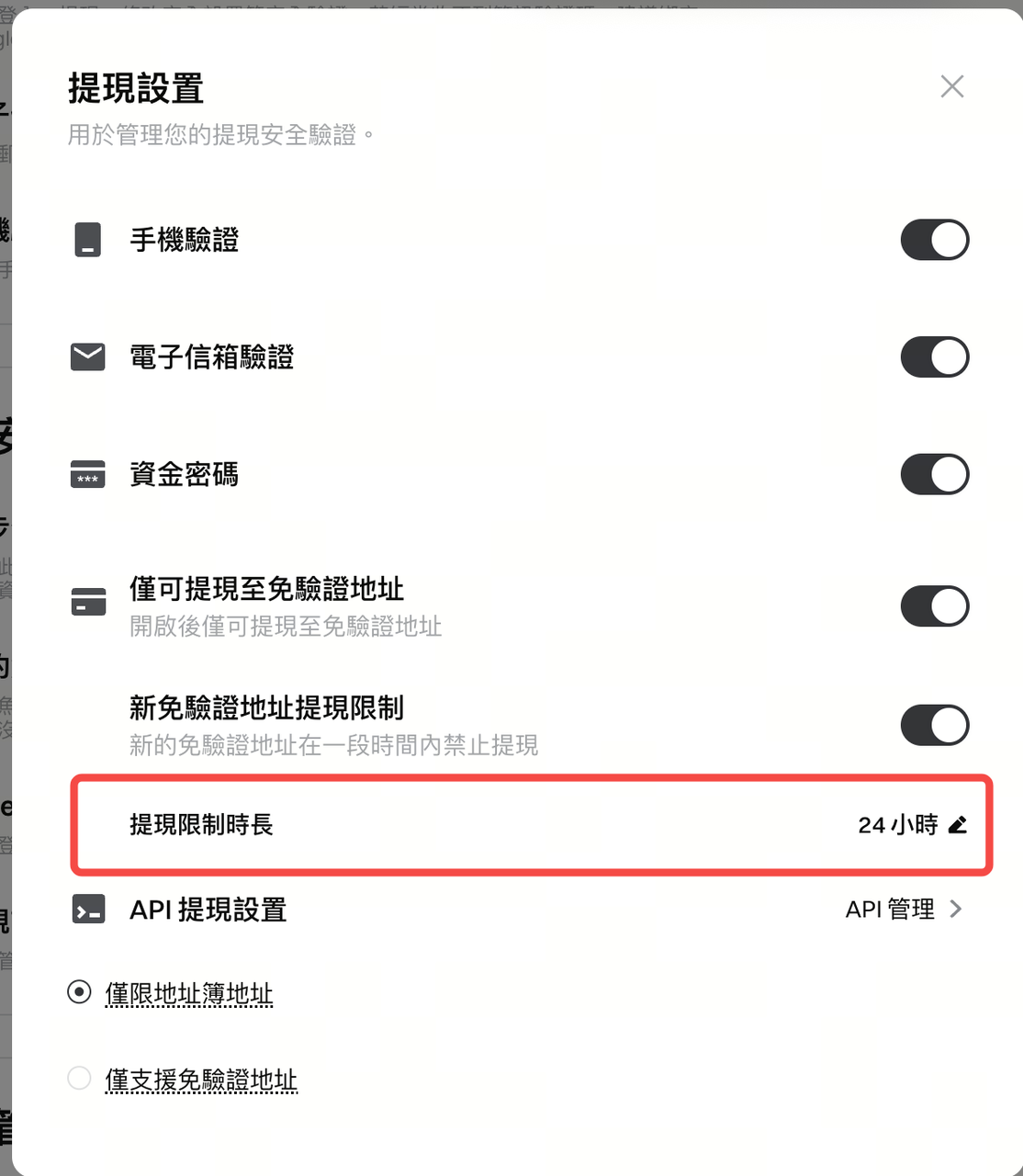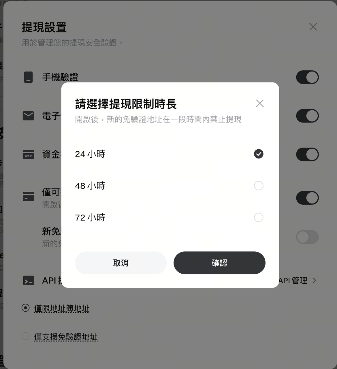 2.開啟新免驗證地址提現限制: 進入設置頁面後,可選擇鎖定時長: 24小時、48 小時或 72 小時