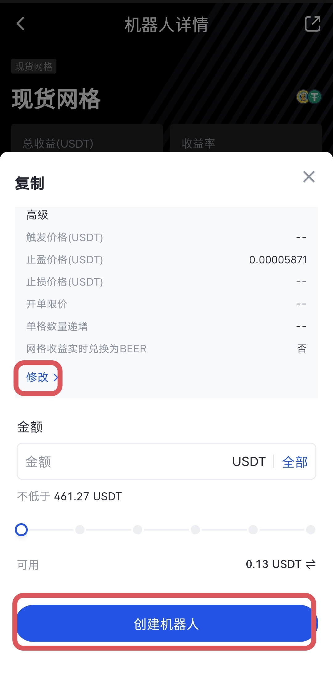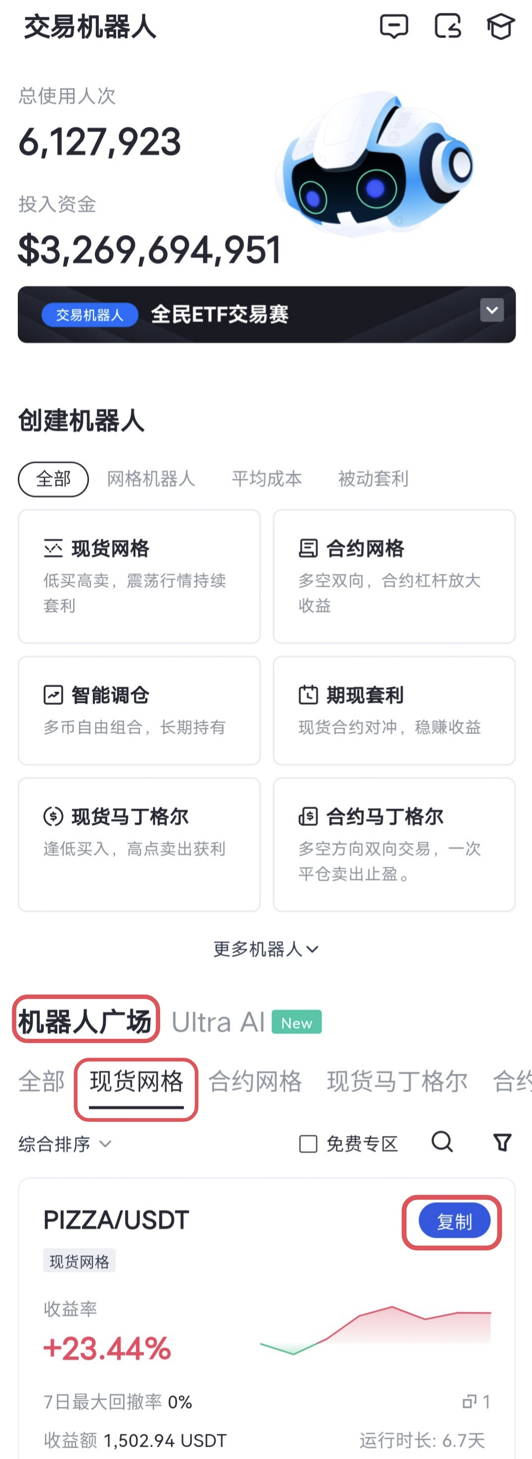 APP端:點擊左上角頭像 - 交易 - 交易機器人 - 機器人廣場 - 現貨網格 - 選擇交易對 - 免費複製 - 參數配置 - 創建機器人