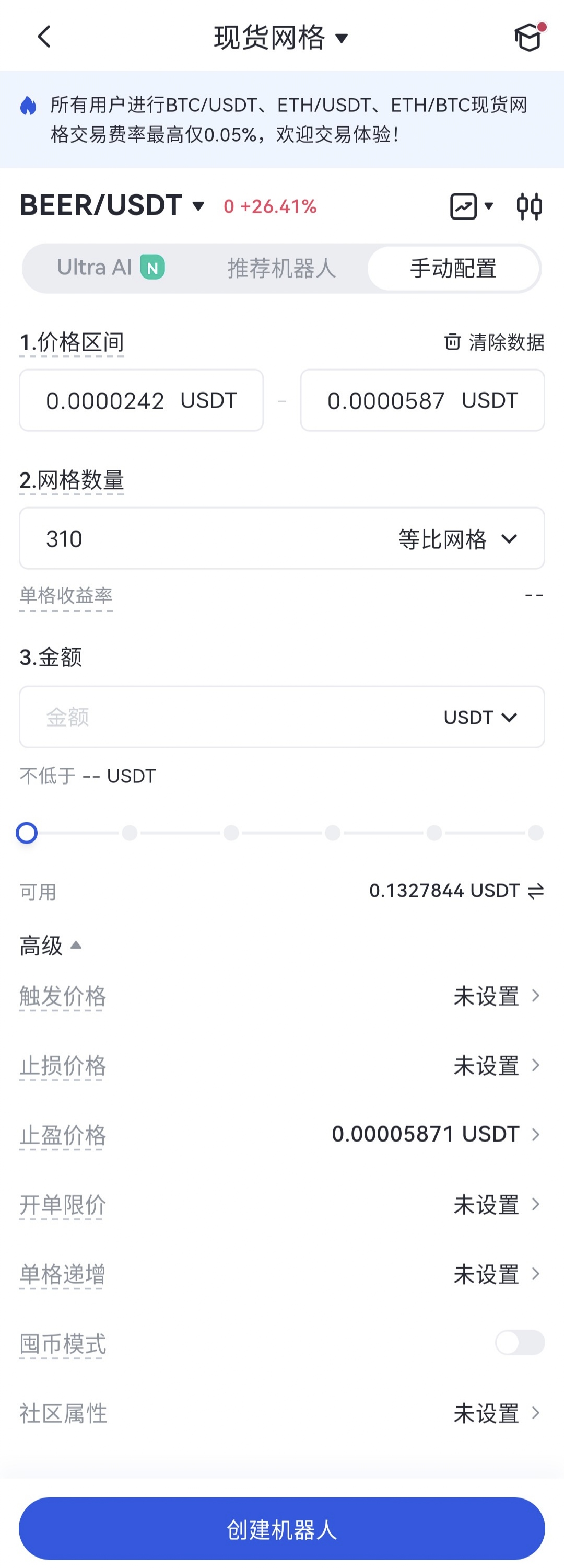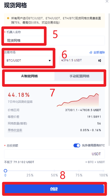 如果您是新手,建議您使用“AI 智能網格”。AI 智能網格是根據近 7 天的歷史數據,進行回測,自動算出收益率最高的網格參數: 上限價格、下限價格、網格數量,用戶只需選擇投資金額比例(選擇的投資額必須大於等於最低投資額)。如果您是有經驗者,您可以使用“手動配置網格”,根據自己的需求來配置參數。