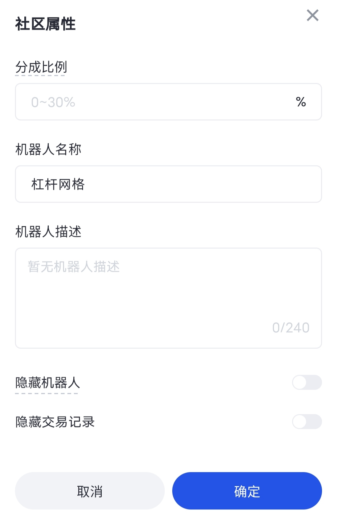 社區屬性:包括分成比例、機器人名稱、機器人描述,可以選擇是否隱藏機器人和隱藏交易記錄。