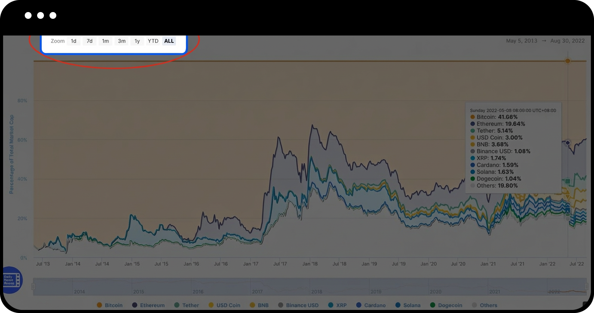 BTC作為整個加密資產的鼻祖,一直以來其行情走勢決定了整個加密資產市場的牛熊。整個山寨幣走勢與BTC的行情走勢呈強相關性。因此,在選擇合約交易對時,首選BTC是所有加密資產合約玩家的共識。下圖為BTC市場佔有率走勢: