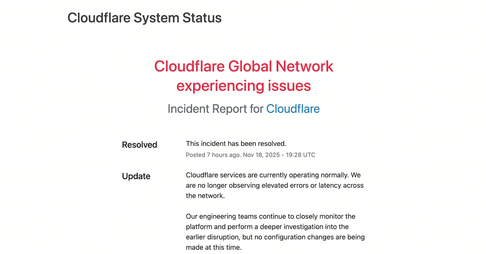 「我們已排除問題,會持續監控系統,確保服務全面恢復。」本事件顯示,當網路底層環節失效時,影響不會只限單一平台,而是能瞬間蔓延整個網際網路。