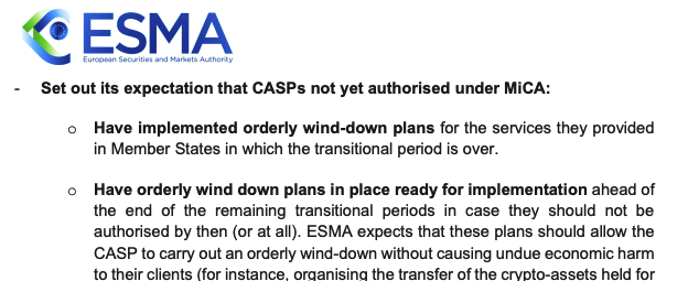總部位於巴黎的歐洲證券及市場管理局(ESMA),歐洲主要監管機構,負責監督MiCA合規性,去年12月表示,預計未獲得MiCA授權的加密公司在過渡期結束後,應制定“有序退出”計劃。