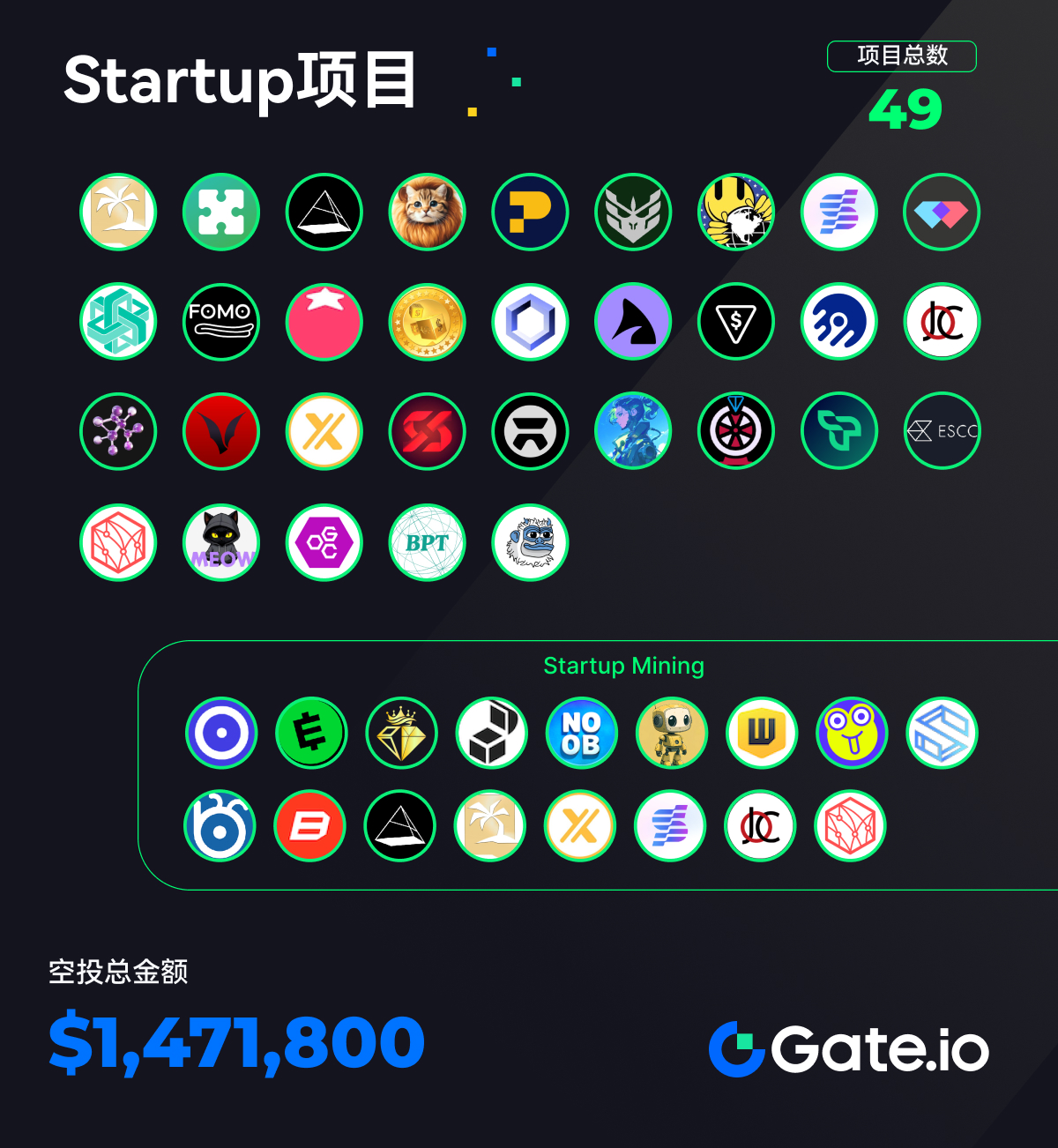 本周期Gate上线了32个新项目和49个Startup项目,总空投价值为147.18万美元。