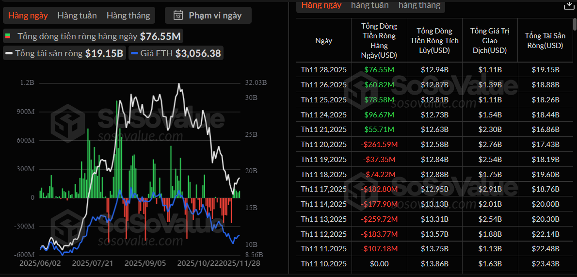 在11月24日至28日(东部时间)期间,基于加密货币的现货ETF市场记录了积极的收复失地信号,在经历了多周的低迷后。具体来说,Ethereum现货ETF吸引了高达3.13亿美元的净流入,正式在连续三周资金流出后转向回升。这一走势反映了投资者对ETH的心理显著改善。