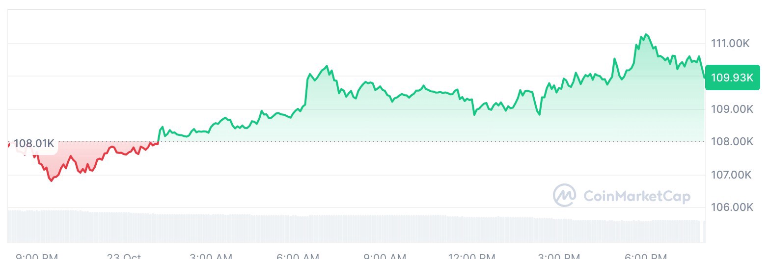 截至2025年10月24日早上5:10 (韩国时间),加密货币市场呈现混合趋势。根据数据平台,比特币的交易价格为$110,190.34 (约158.49百万韩元),比前一天上涨2.10%。